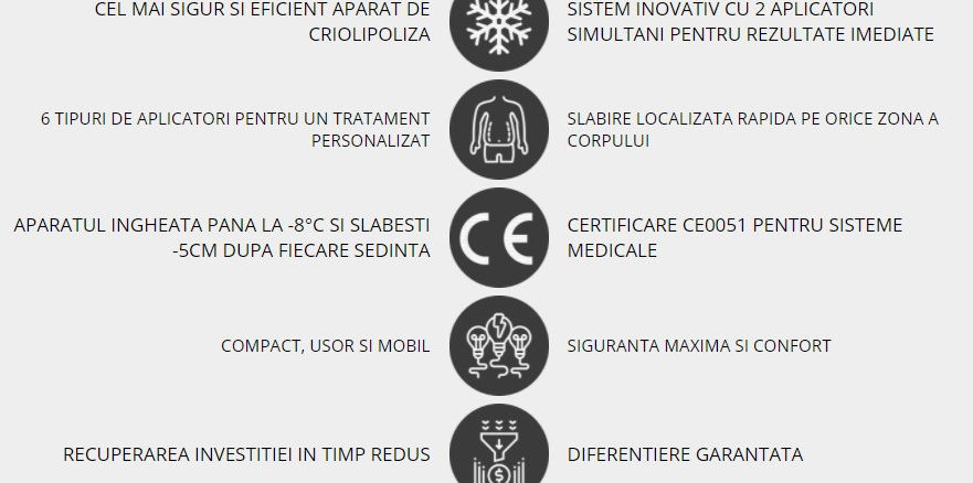 Astfel, pacientii dumneavoastra se vor putea bucura de un tratament de slabire localizata rapida, fara efecte secundare. Avantajele majore ale aparatului de criolipoliza CoolTech sunt rezultatele vizibile imediat, siguranta pacientului si recuperarea rapida a investitiei datorita eficientei tehnologiei. Toate aceste elemente fac din aparatul de criolipoliza CoolTech una dintre cele mai bune solutii de slabire localizata si remodelare corporala pentru clinici si saloane de infrumusetare.